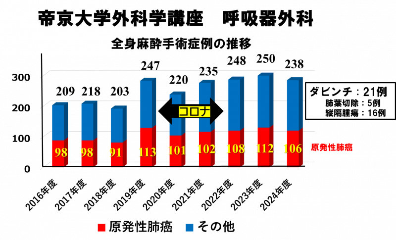 昨年度(2024年度)は240例弱の全身麻酔手術を手がけました。昨年度は看護師不足から3か月間ほど手術数の制限を設けなければならず、皆様にはご迷惑をおかけしたことと存じます。その影響もあり、前年より実施手術数が減少致しました。手術の中では、肺癌が最頻の疾患(110 例弱)ですが、気胸や膿胸など救急外来を経由した症例も増加しております。アプローチではダビンチ手術(ロボット)や胸腔鏡手術が主体ですが開胸での拡大手術も少なくありません。